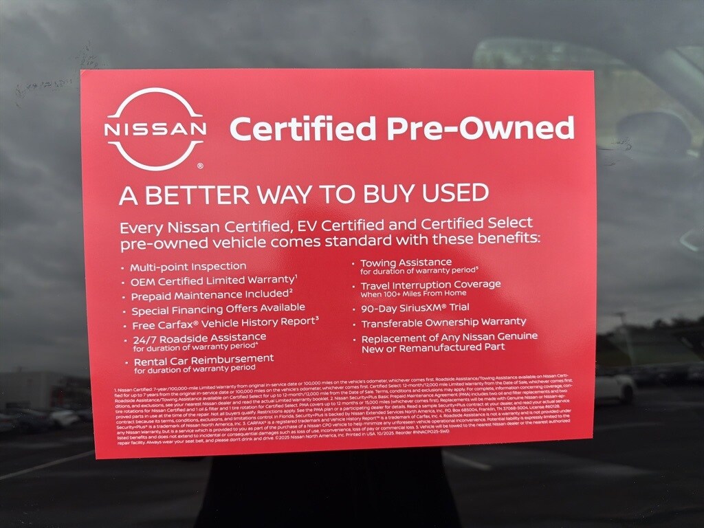 * 7 Year/100,000 Mile Limited Warranty, 24/7 Hour Roadside Assistance, Carfax Vehicle History Report, Plus 1 Year Pre-Paid Maintenance Included. Gas Powered Nissan Models Only.